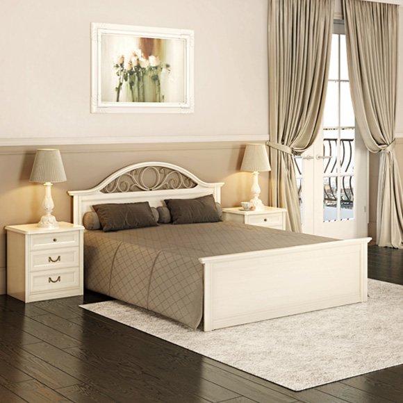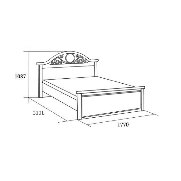 Двуспальная кровать с гнутой головной и прямой ножной спинками. Головная спинка декорирована кованым элементом.
