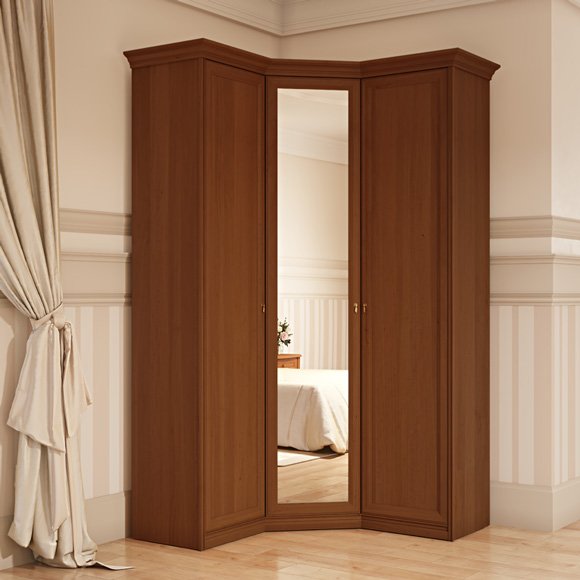 Шкаф угловой для платья и белья состоит из трех секций: две боковые и центральная. В центральной секции расположены две полки и штанга. В боковых отделения по четыре полки для белья. Возможна левосторонняя и правосторонняя сборка изделия. Центральная дверь шкафа оборудована зеркалом.