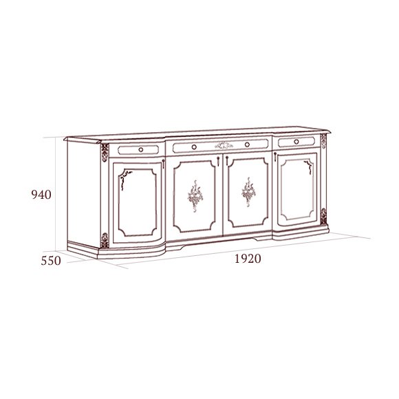 Фасады левой и правой части комода Floriana волнообразно изогнуты. Предмет гарнитура изготовлен с применением массива и шпона натурального дерева. Цоколи и карнизы декорированы золотом. В отделке фасада применен художественный набор шпона. Цена указана без учета стоимости зеркала.