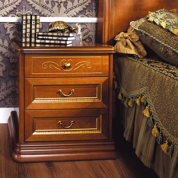 Тумба, мебель для спальни в итальянском стиле Luigi, выполнена с использованием массива и шпона натурального дерева. Декорировано отделкой с золотом.