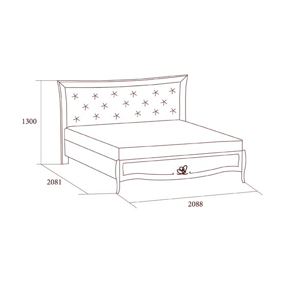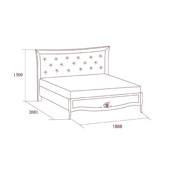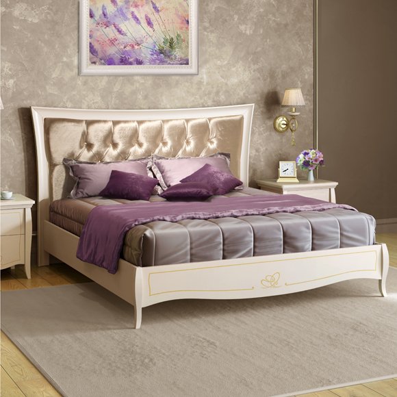 Кровать без ножной спинки изготовлена с применением натуральных материалов массива дуба и шпона ясеня с отделкой декапе в бежевом цвете.Головная спинка драпирована тканью в технике каретная стяжка (капитоне). Ножная спинка украшена художественным орнаментом, выполненным по инновационной технологии с применением золотого глиттера. Стоимость указана без учета матраса и тахты.