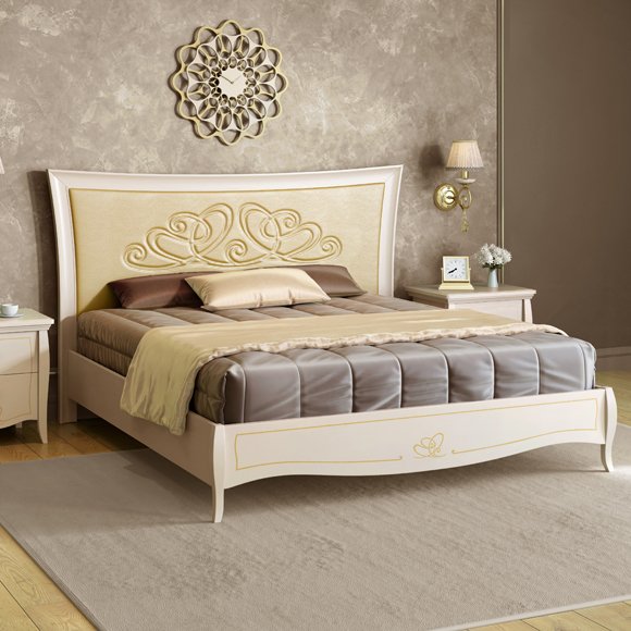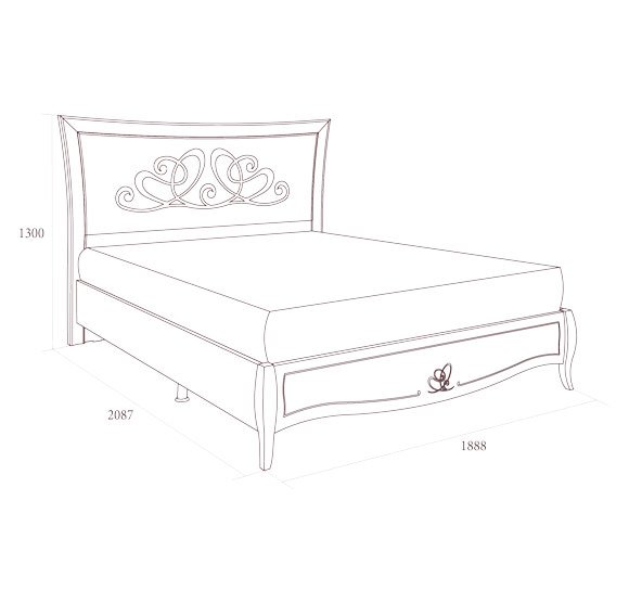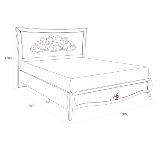 Кровать без ножной спинки изготовлена с применением натуральных материалов массива дуба и шпона ясеня с отделкой декапе в бежевом цвете. Головная спинка кровати драпирована экокожей и декорирована оригинальной строчкой. Ножная спинка украшена художественным орнаментом, выполненным по инновационной технологии с применением золотого глиттера.