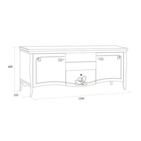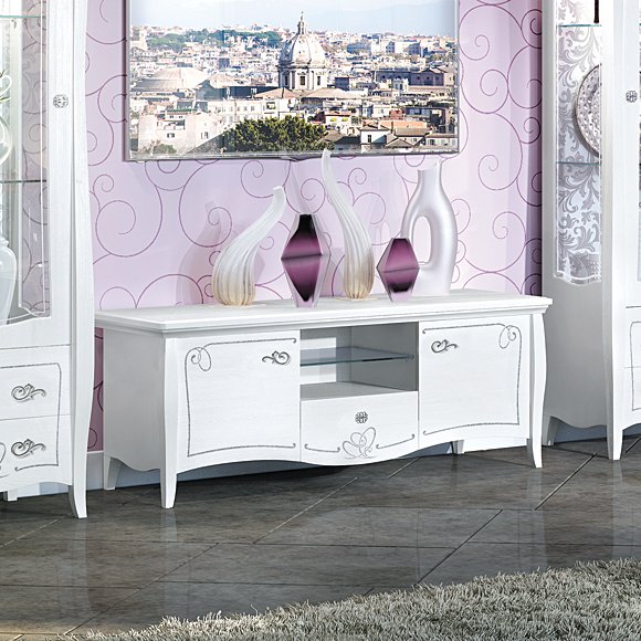 Тумба для телеаудиоаппаратуры из коллекции мебели Viola обустроена отделением со стеклянной полочкой и ящикам.