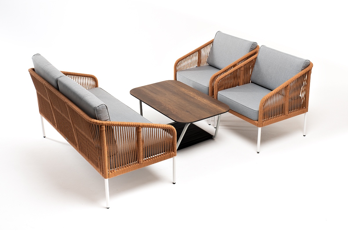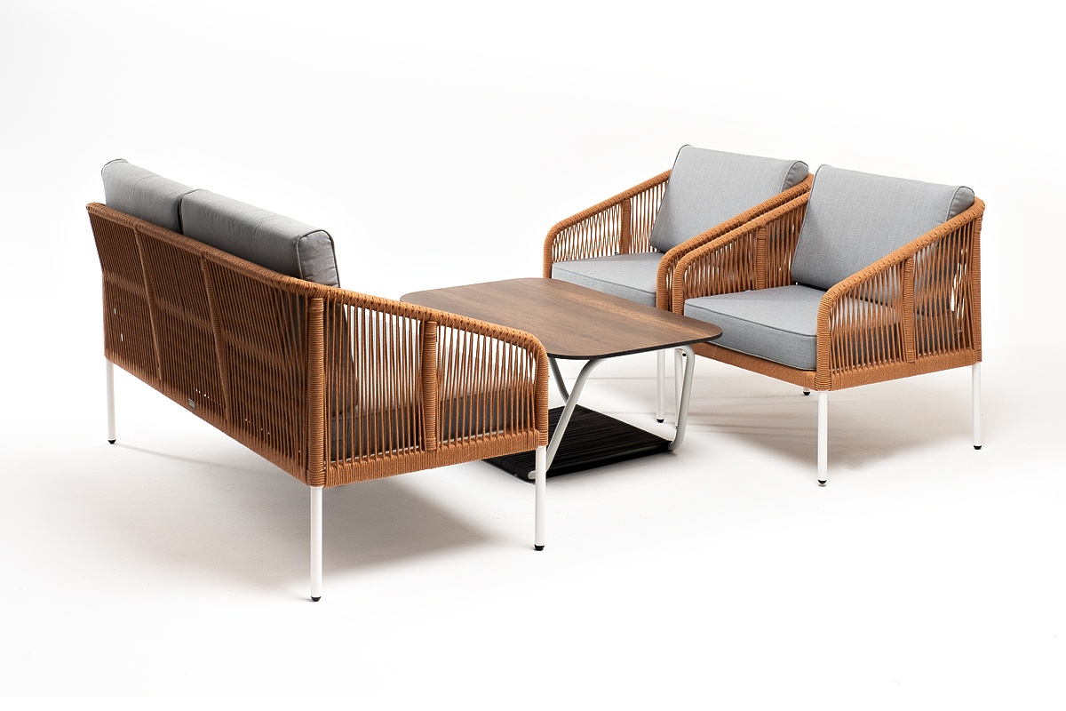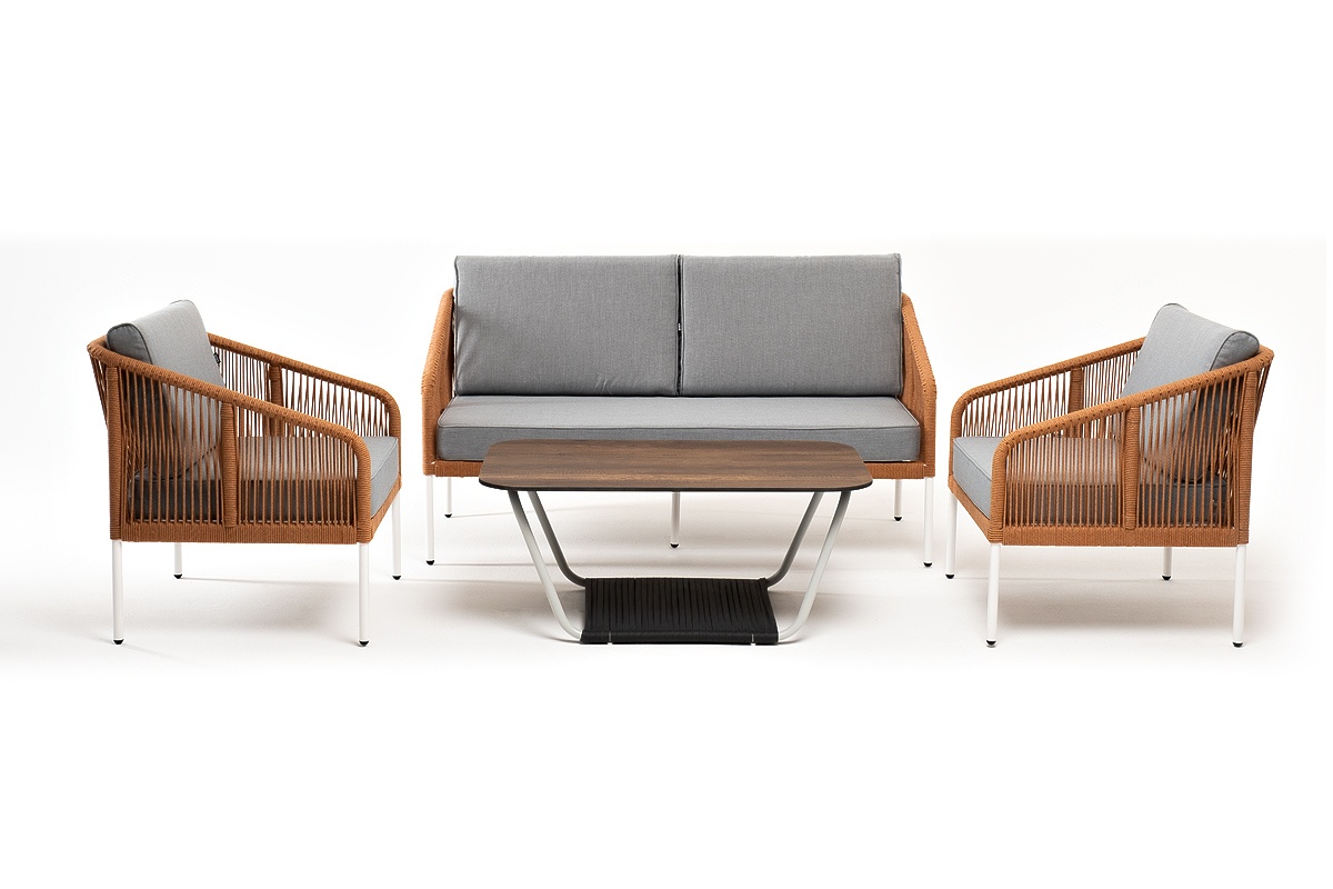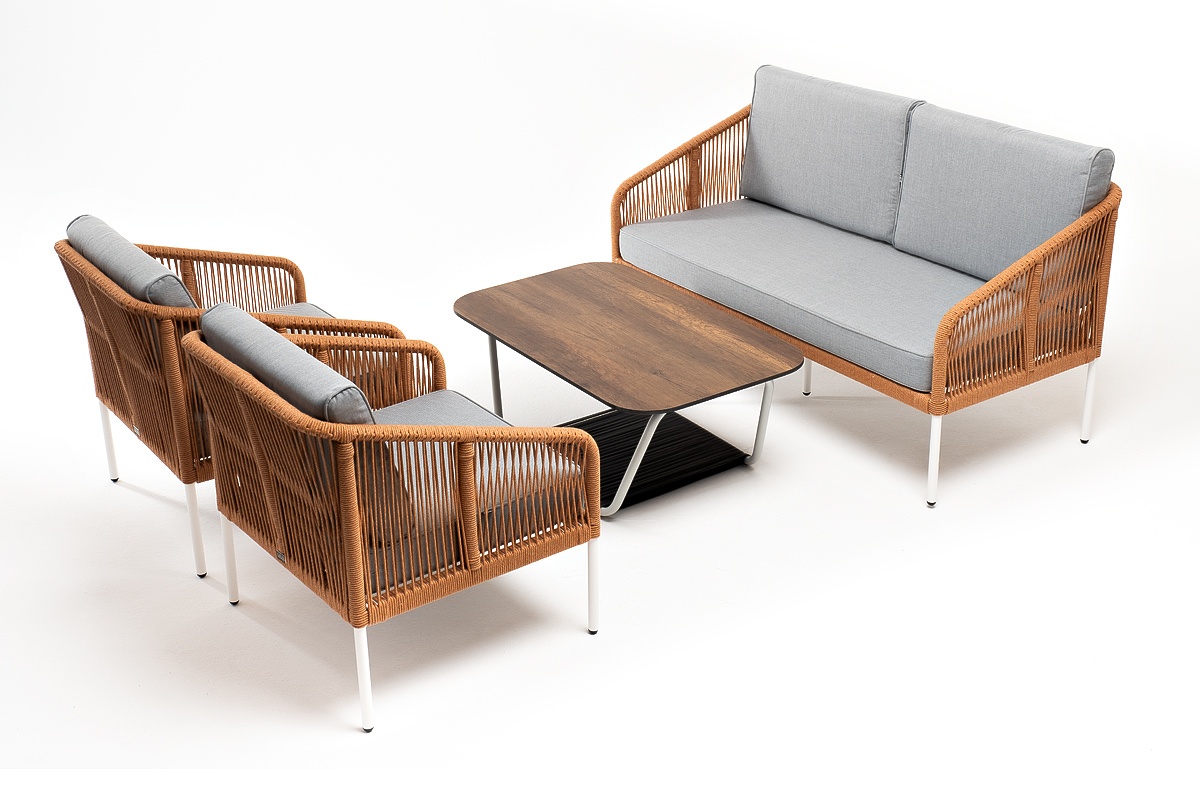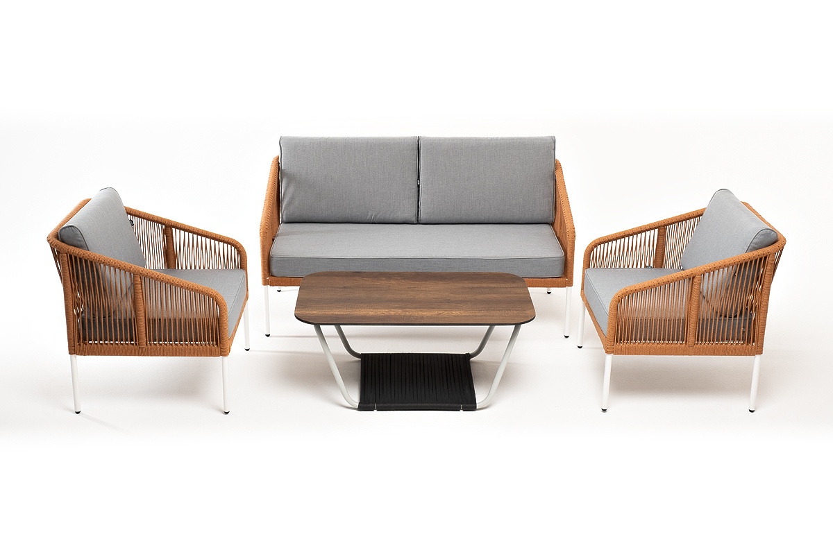 МЕБЕЛЬ ИЗ ИСКУССТВЕННОГО РОТАНГА • КОМПЛЕКТЫ ИЗ ИСКУССТВЕННОГО РОТАНГАДля сада и дачи • Комплекты для отдыха из искусственного ротангаKANS2C2TJ-4-RC644-SET mel-orange Канны лаунж-зона 4-местная из роупа со столом Глория цвет дуб, каркас алюминиевый белый, роуп оранжевый меланж