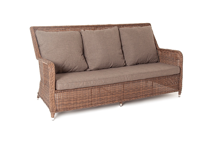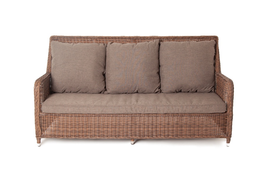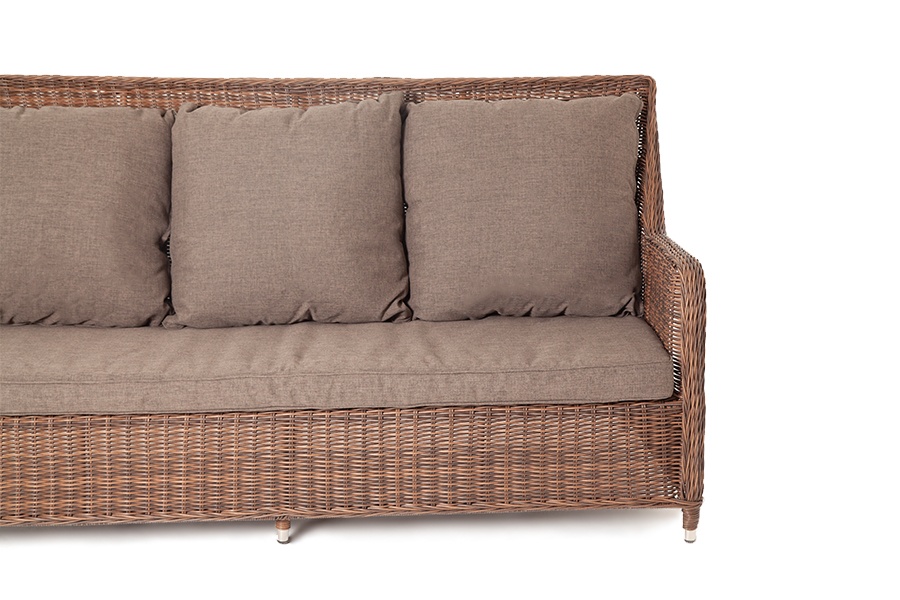 Диван из искусственного ротанга Гляссе оснащен каркасом из алюминия, оплетенного круглым искусственным ротангом коричневого цвета. Размер дивана - 1900x880x990 мм. Подушки и матрас со съёмными чехлами, обработаны влагоотталкивающими средствами, подлежат машинной стирке.