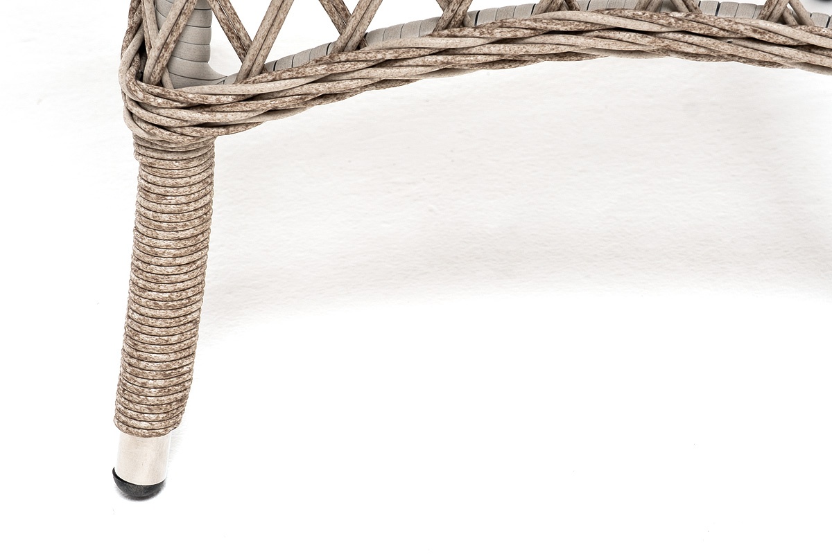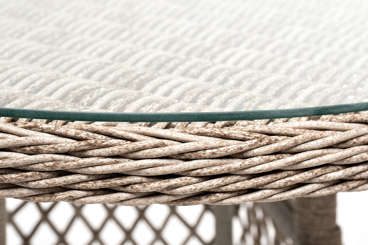 Каркас изготовлен из прочного и очень легкого алюминия. Вручную оплетен синтетическим ротангом натурального бежевого оттенка.   Столешница покрыта прочным стеклом, толщиной 5 мм. Благодаря высокопрочным материалам, обеденный стол очень практичный и подходит для всесезонного использования даже на улице.