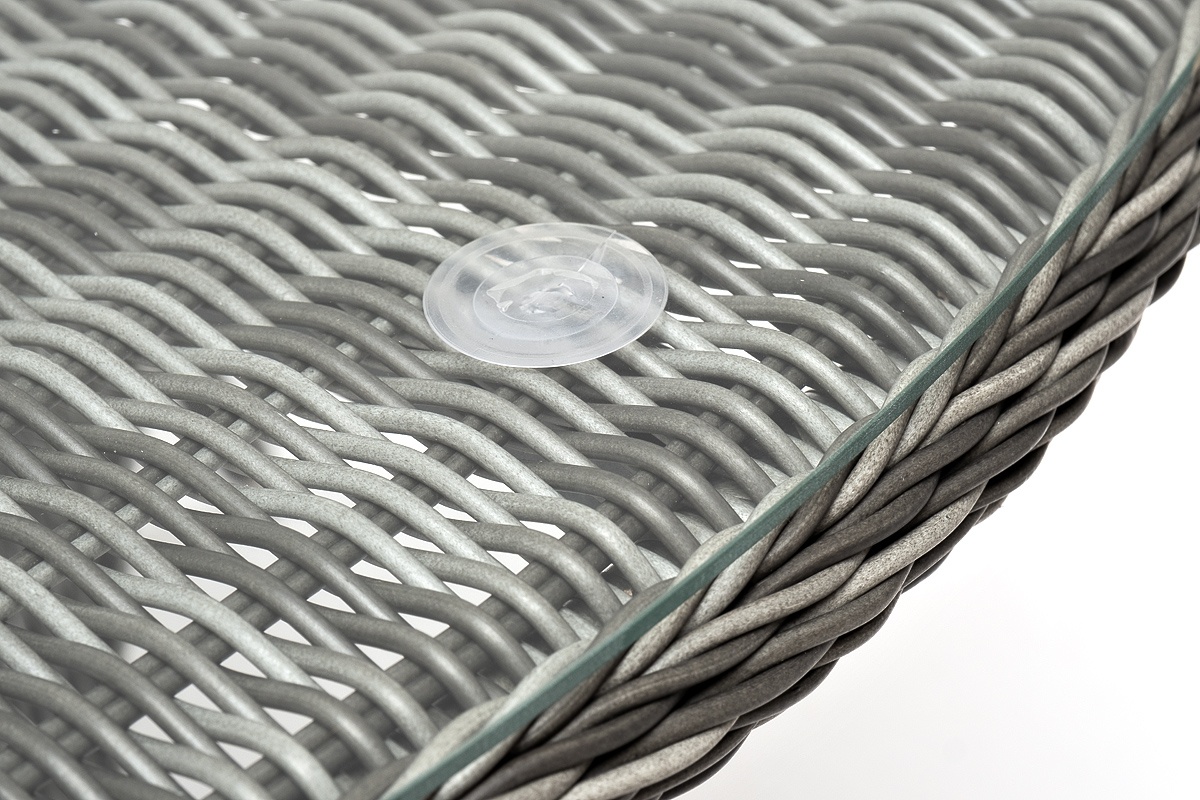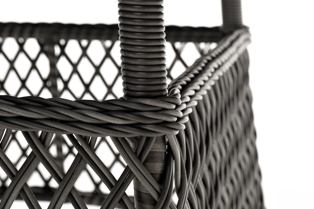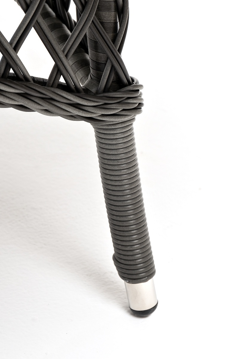 В качестве основания выступает каркас, выполненный из алюминия и оплетён круглым искусственным ротангом графитового цвета.