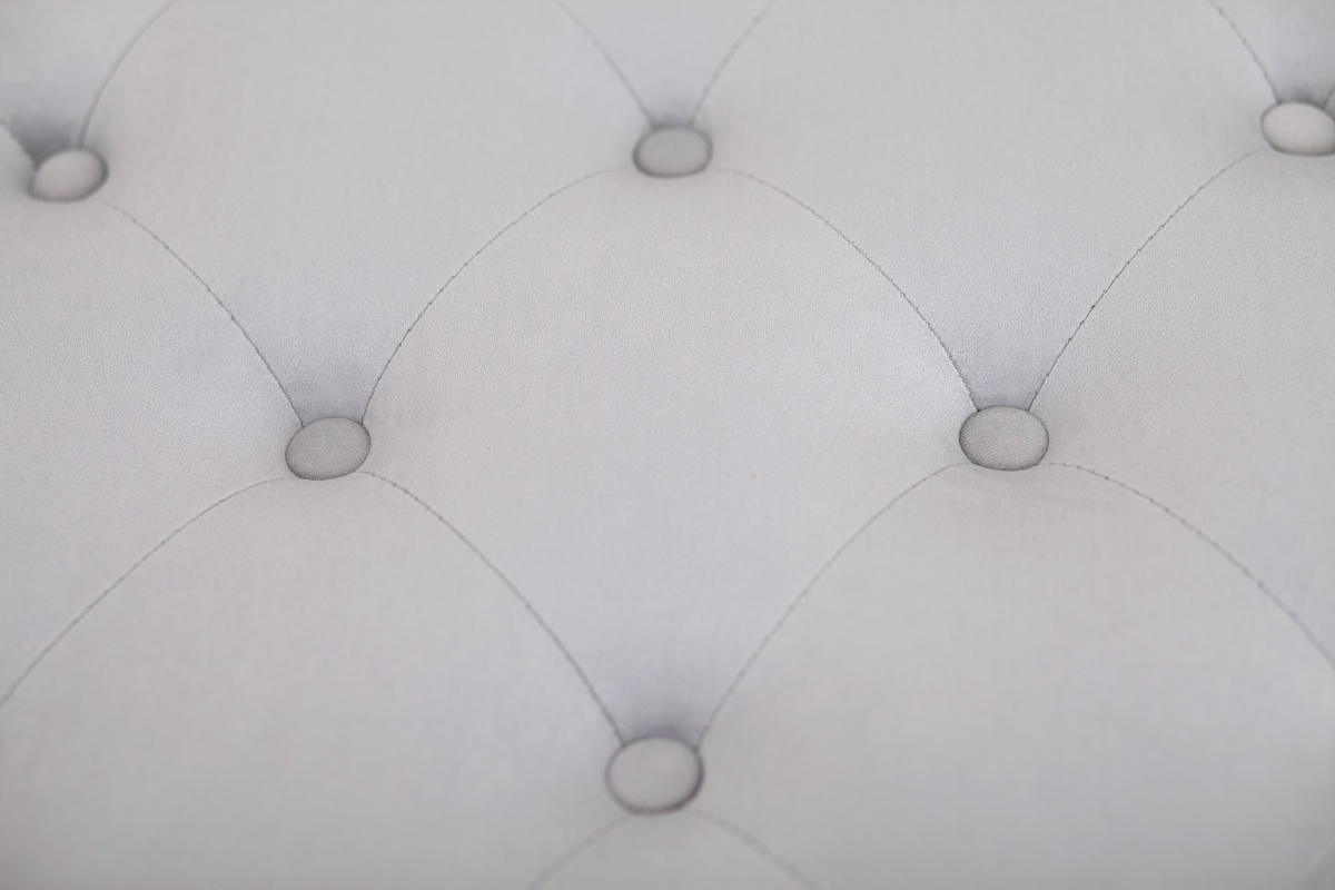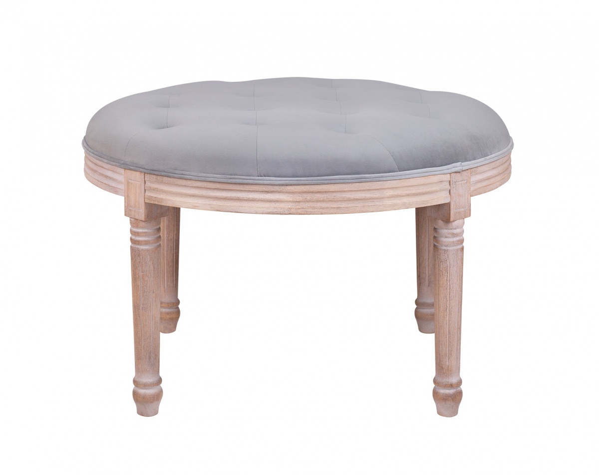 Банкетка Emory gray с мягким сиденьем в форме круга диаметром 71 см и резными ножками высотой 32 см. Каркас модели выполнен из каучукового дерева, в качестве обивки использован велюр серого цвета. Изделие декорировано мебельными пуговицами, расположенными на тканевой поверхности в шахматном порядке.