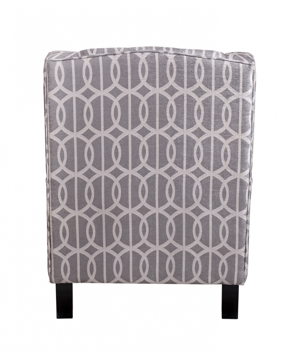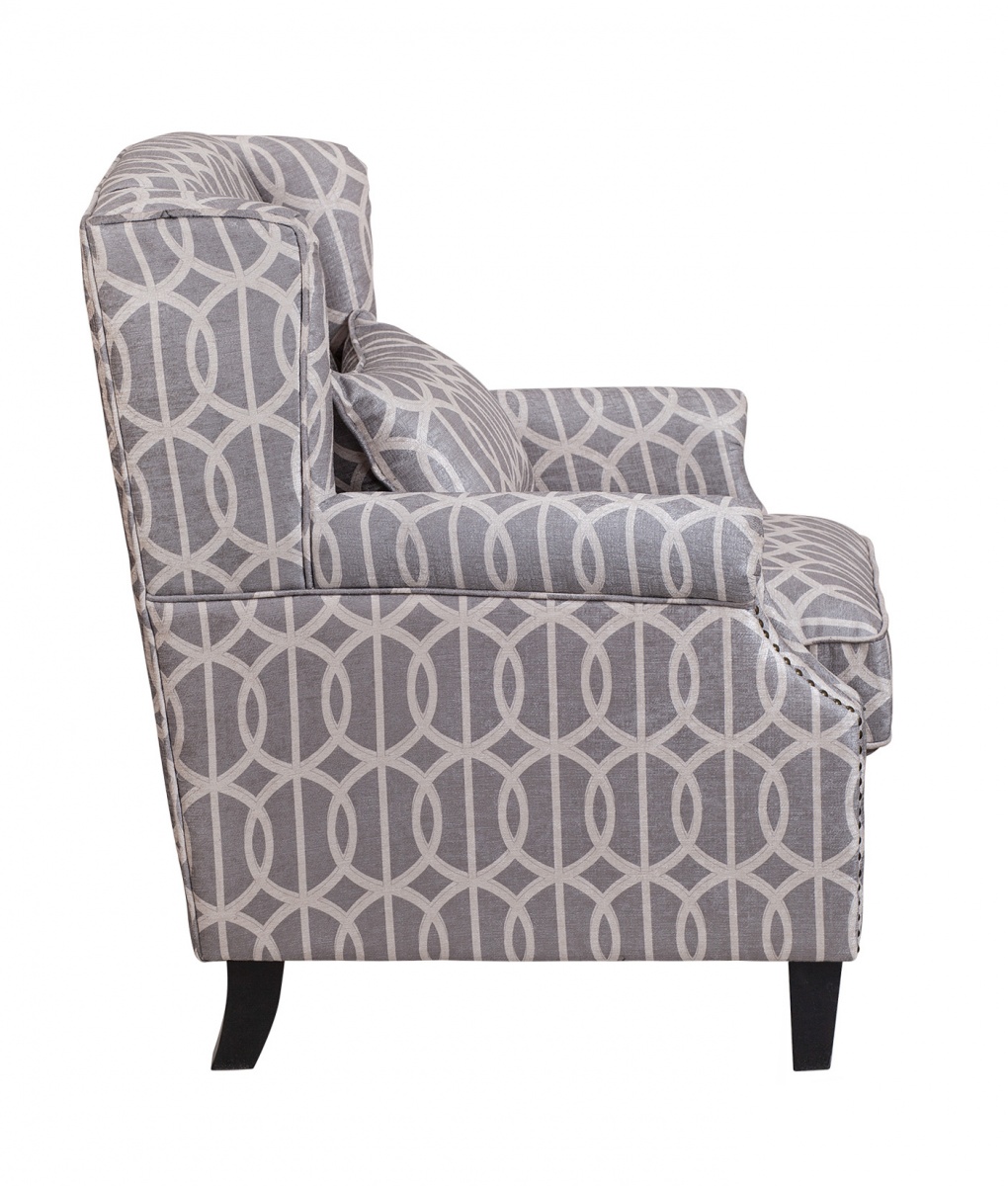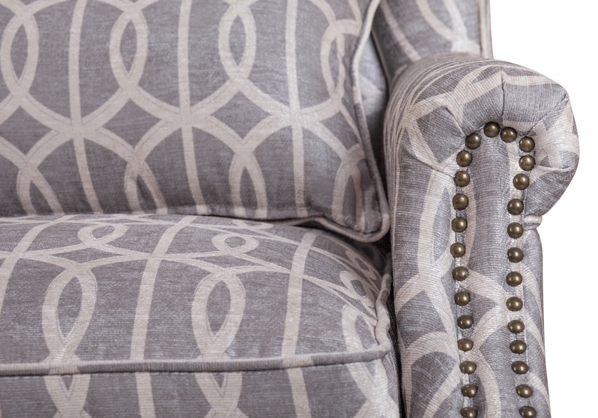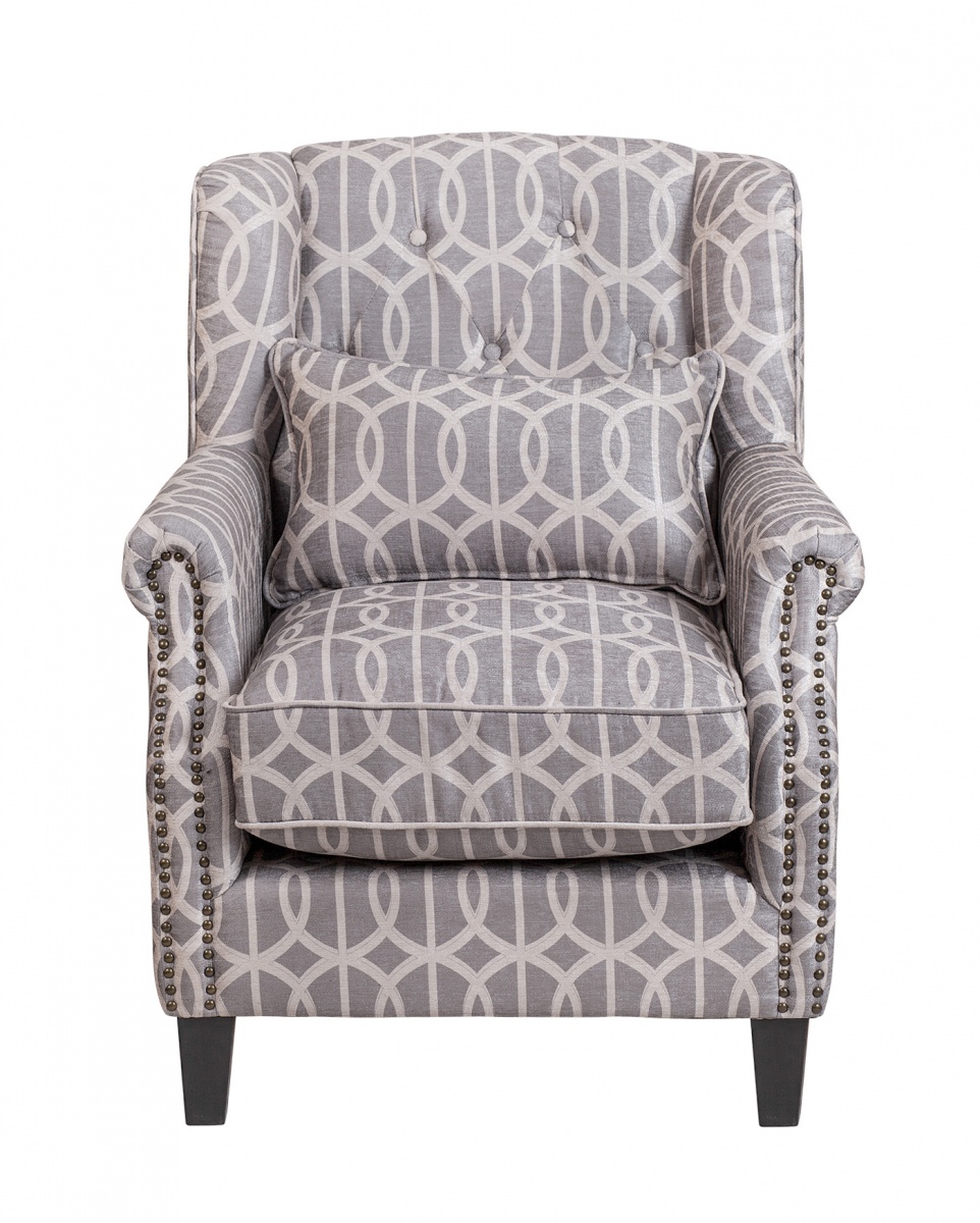 Кресло Scott Grey выполнено в элегантном дизайне, на основе прочного деревянного каркаса, упругого наполнителя и мягкой обивки из натуральной ткани. По синему фону материи проходят белые контуры ромбов, лицевая часть закругленных подлокотников декорирована заклепками. Модель поставляется в комплекте с маленькой подушкой с верхом из той же ткани.