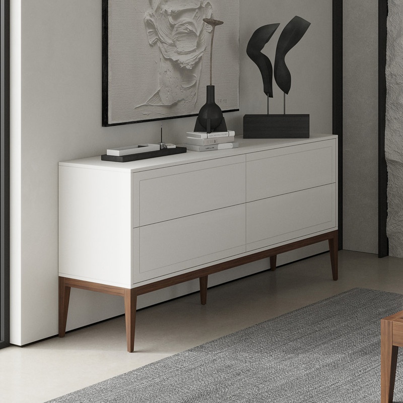 Широкий белый комод с четырьмя ящиками, на высоких ножках (орех) из коллекции Marbella от испанского бренда MOD Interiors. Модель с дизайнерской фрезеровкой фасадов в лаконичном стиле.