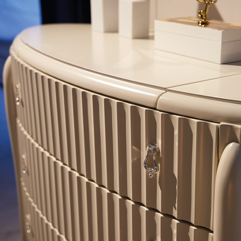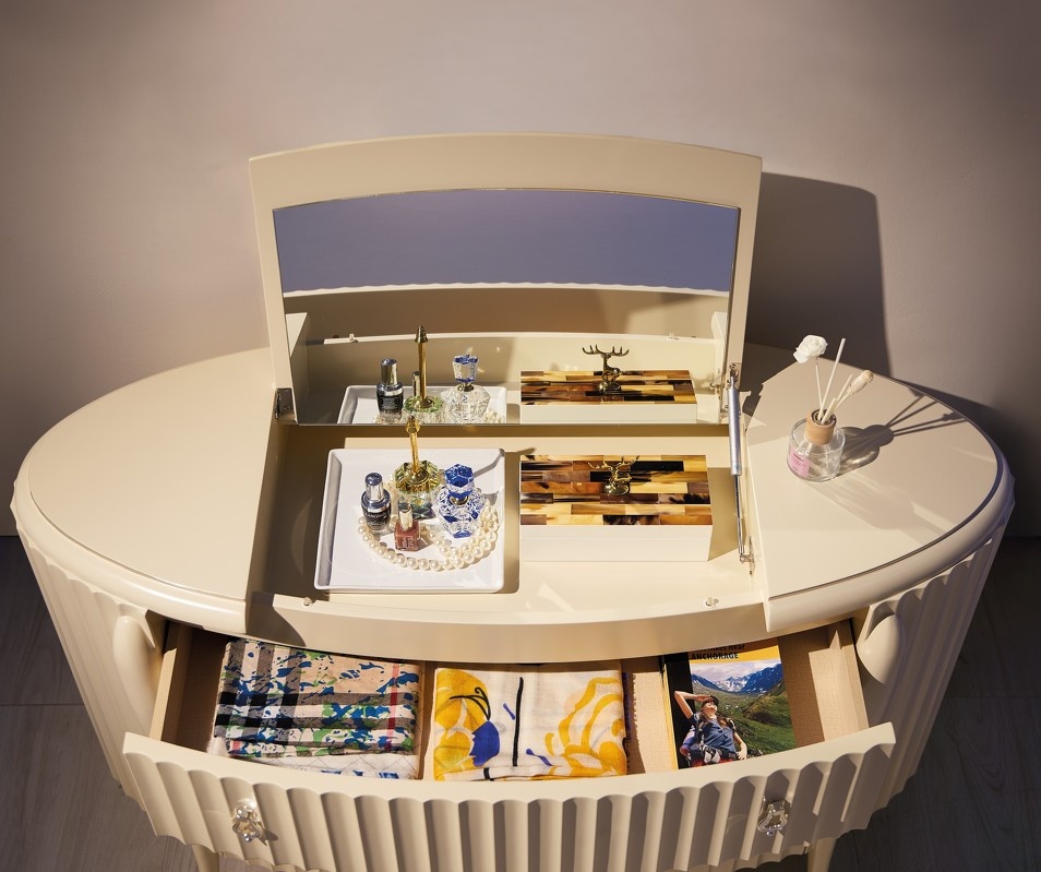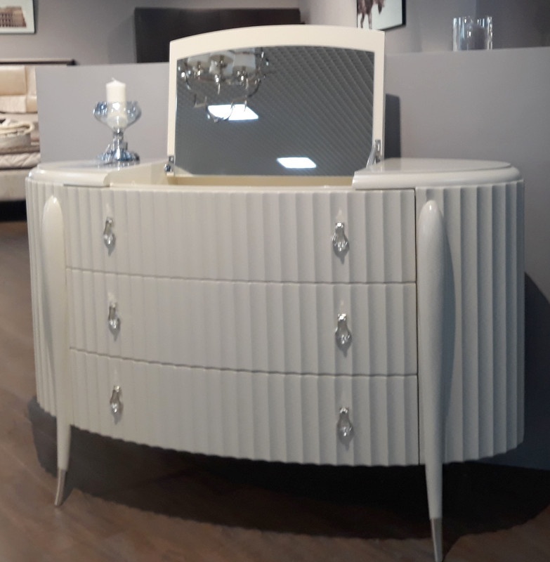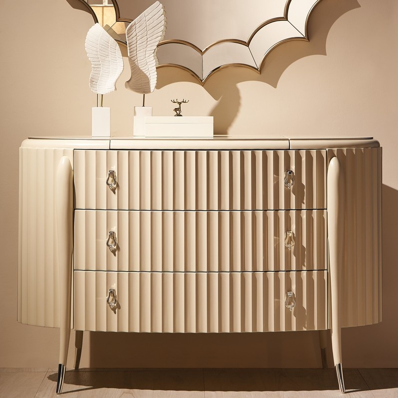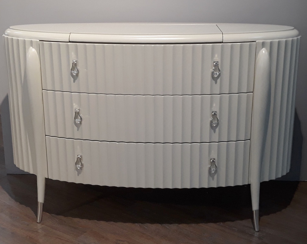 Особенности товара: Элегантный комод от итальянского бренда Fratelli Barri на объемных изогнутых ножках и с модным рифленым фасадом. Модель выполнена в стиле неоклассика с оттенком ар-деко. Комод овальной формы. Ножки с металлическими наконечниками. Изготовлен из массива дерева и высококачественной МДФ высокой плотности. Модель оснащена 3 большими ящиками со скрытыми направляющими и дополнительным отделением в столешнице - с подъемной крышкой и зеркалом. Ящики оснащены доводчиками для плавного закрывания. Цвет фурнитуры - хром.