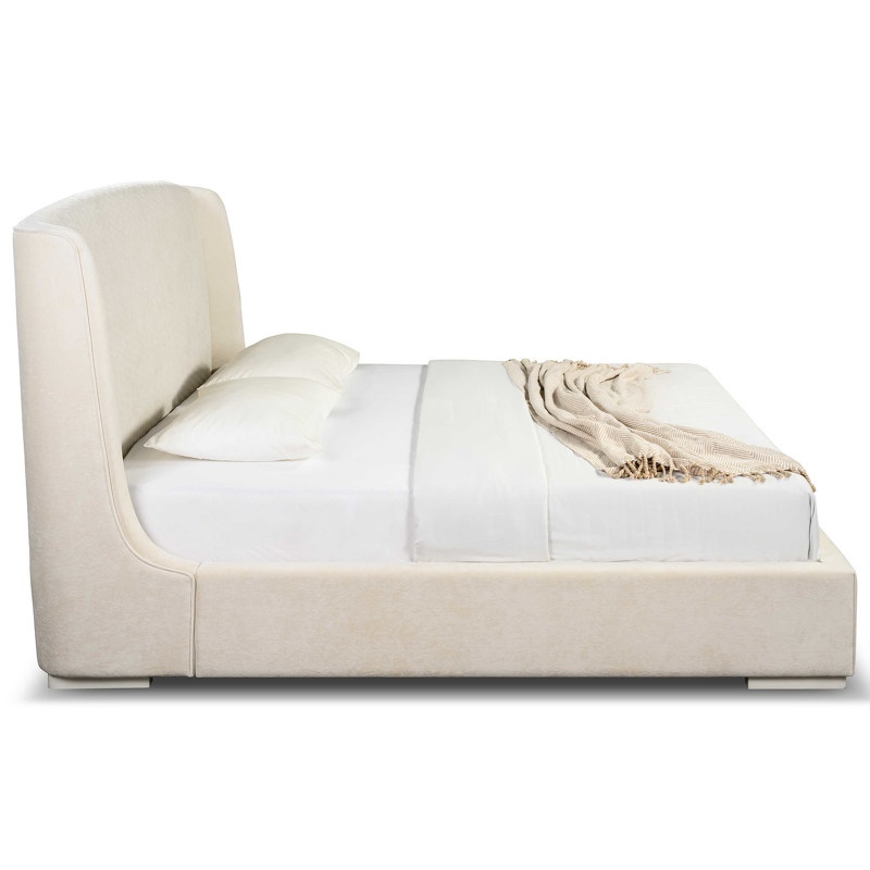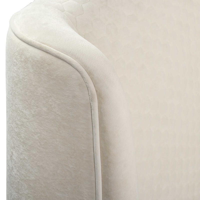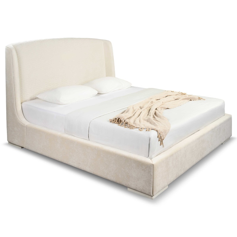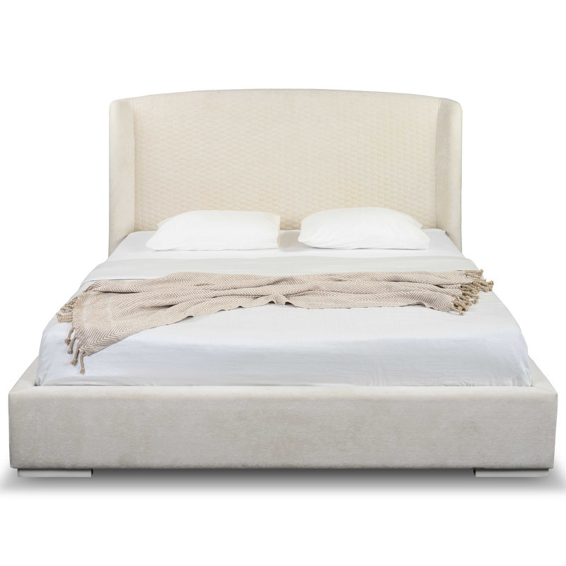 Двуспальная кровать на низких ножках выполнена в стиле ар-деко. В центре изголовья &mdash едва видимая на фото орнаментальная стежка.