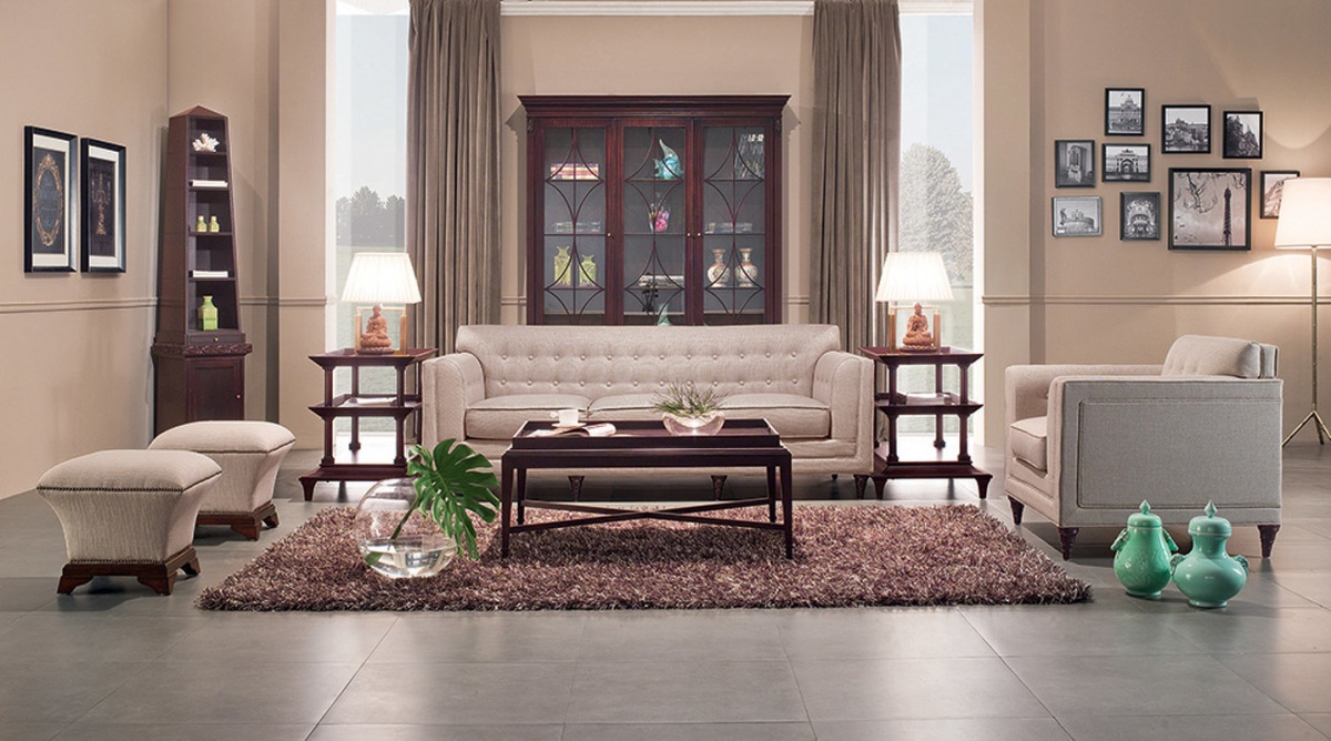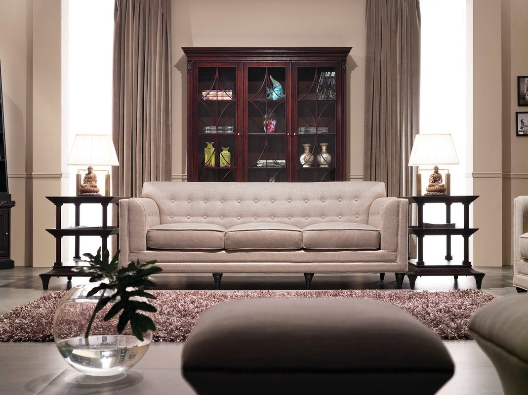 Особенности товара: Диван 3 местный выполнен в стиле Неоклассика. Ножки в отделке шпон махагона. Обито тканью кремовая рогожка, внутренняя часть спинки декорирована стежкой капитоне с пуговицами в ткани. Каркас сделан из массива дерева.