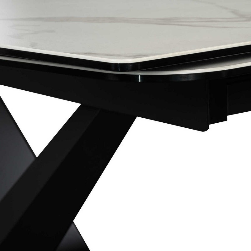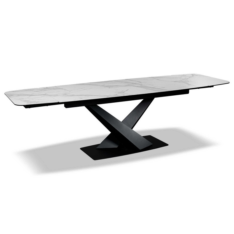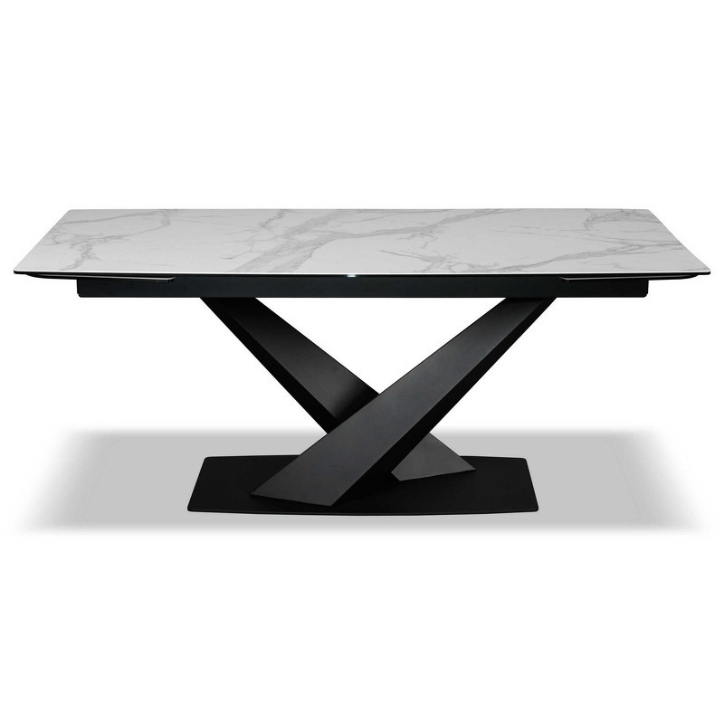 Раздвижной обеденный стол с фигурной ножкой от испанского бренда Mod Interiors выполнен в современном стиле. Столешница прямоугольной формы со скругленными углами изготовлена из закаленного стекла (8 мм) с керамикой (3 мм).