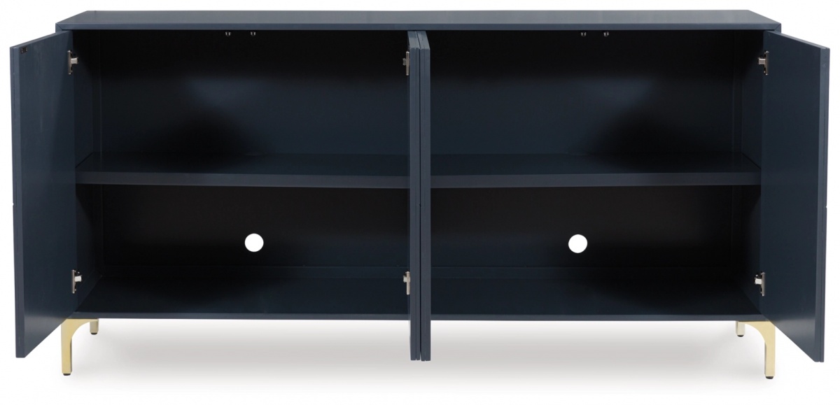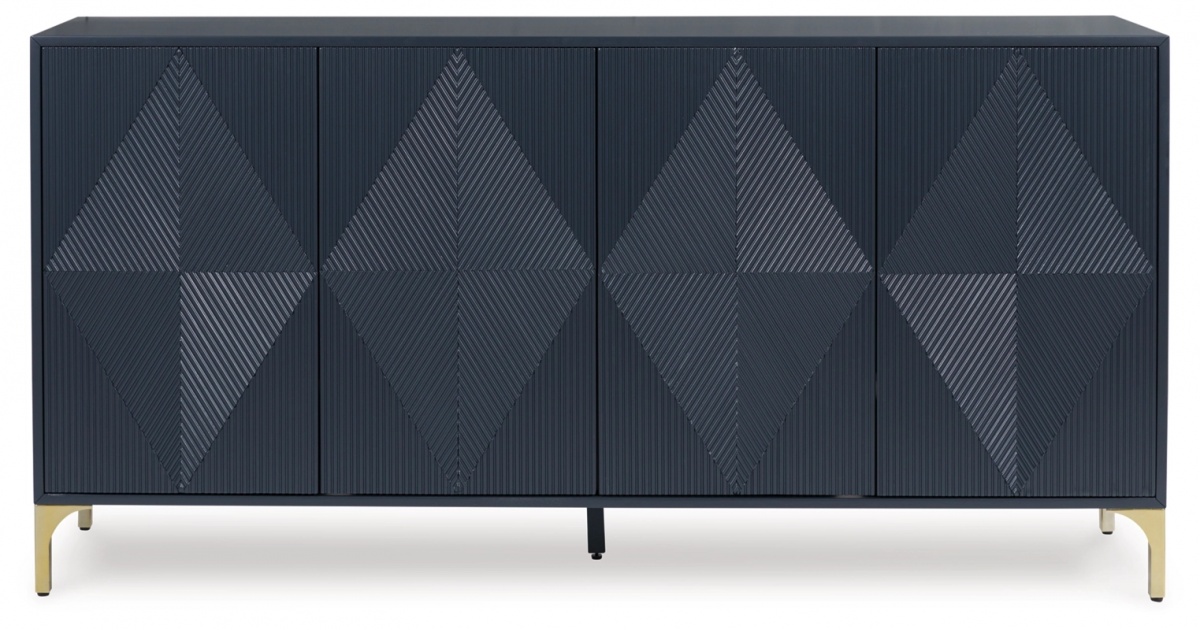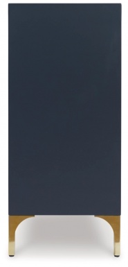 Особенности товара: Поднимите свою эстетику с помощью шикарного дизайна этого акцентного шкафа. Изящные золотистые ножки и эффектные дверцы с геометрическим узором придают современный вид, где бы вы ни разместили этот предмет. Добавьте темно-синюю отделку, и вы получите потрясающую эффектную вещь. Нажимные магнитные дверцы шкафа обеспечивают функциональность и форму, открывая две полки и отверстия для электроники.