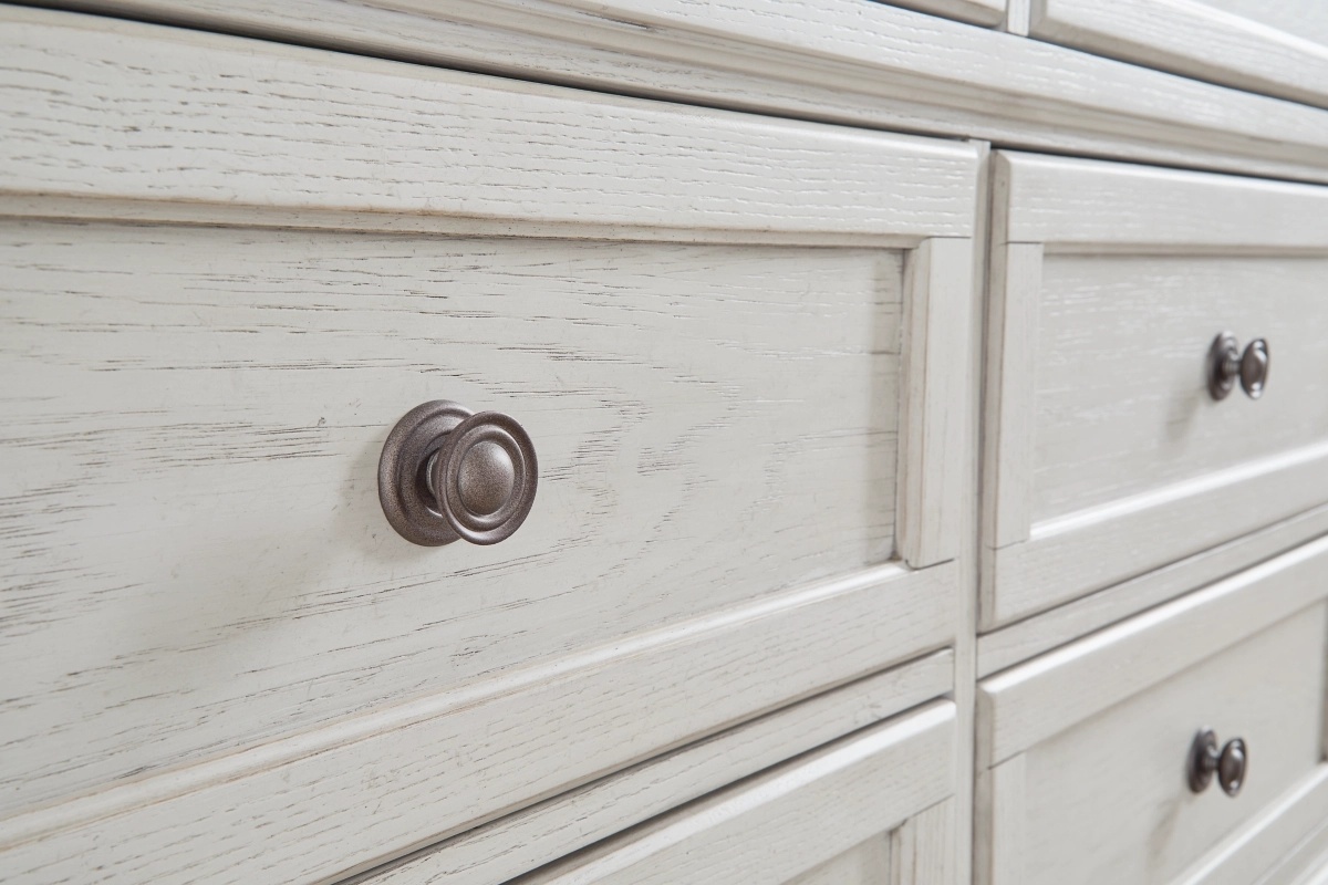 Особенности товара: Элегантная, неподвластная времени мебель выведет вашу спальню на новый уровень. Ничто не делает это лучше, чем этот комод. Белая отделка под старину с прекрасной зернистой текстурой излучает изысканность, а ручки темного бронзового цвета добавляют изысканности. Войлочная отделка верхних ящиков дополняет этот изысканный предмет.