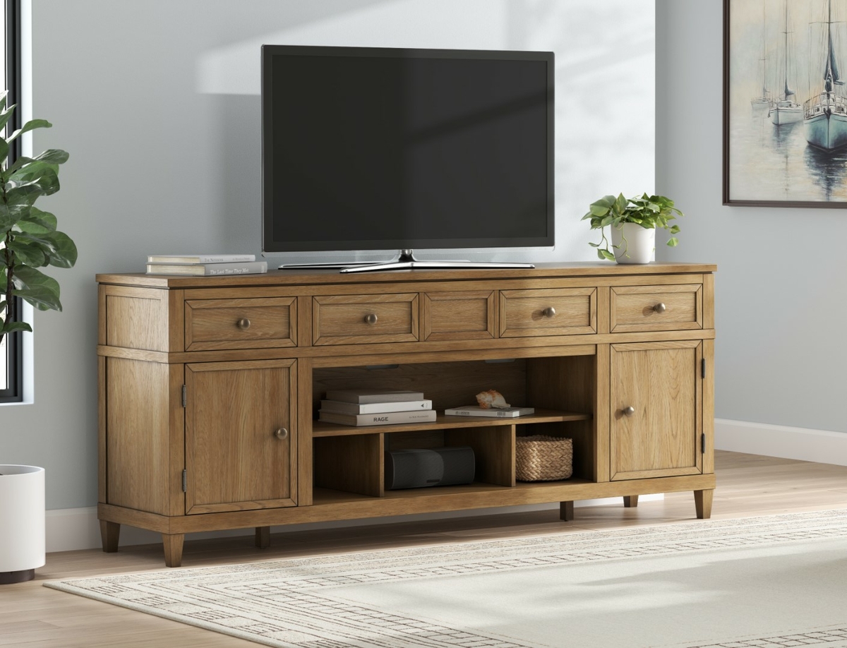 Эта подставка для телевизора, воплощающая вневременной подход к повседневной красоте, привносит непринужденную элегантность в повседневную жизнь. Светло-коричневая отделка под дерево органично впишется в эстетику вашей комнаты. Два просторных шкафа (каждый с регулируемой полкой), четыре выдвижных ящика и полка с открытым центром обеспечивают достаточно места для хранения медиафайлов и электроники. Улучшите впечатления: дополнительная каминная топка (продается отдельно) привнесет в вашу гостиную нотку тепла и прекрасную атмосферу.
